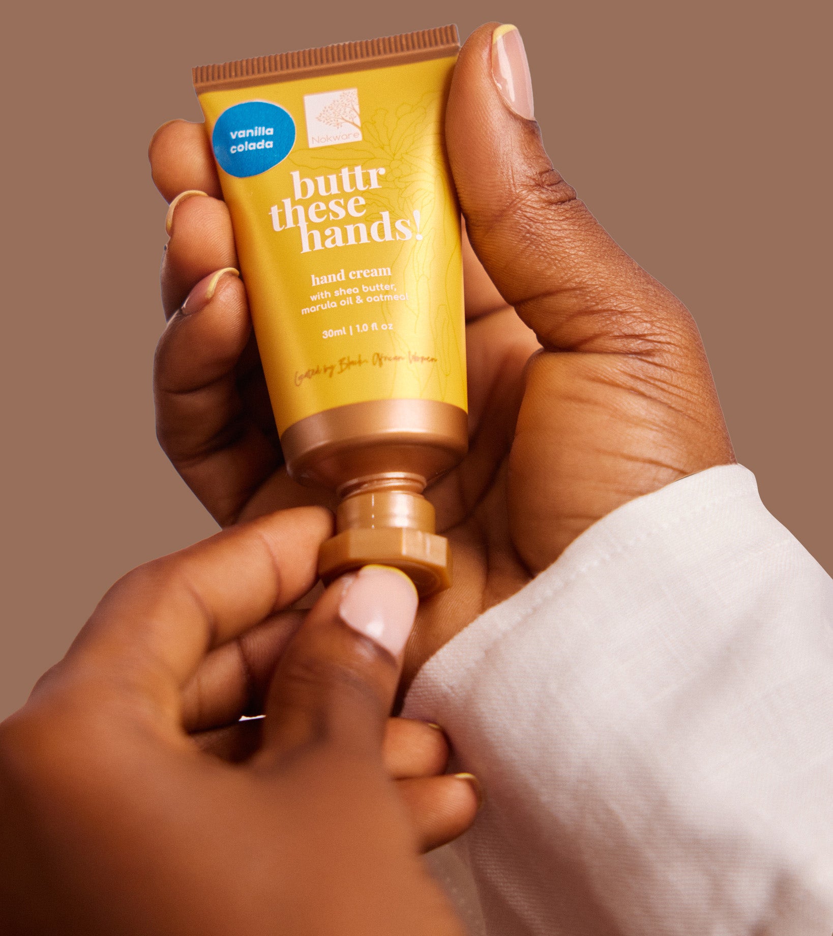 Nokware Buttr these hands lotion is made from ethically sourced shea butter, crafted by local women from the savannahs of Ghana. It is non- greasy, deeply nourishing and made with natural African oils like baobab and olive oil. Our hand cream is packaged in eco-conscious aluminium tubes and penetrates deep to lock in moisture all day, leaving your hands visibly healthier from the first use.